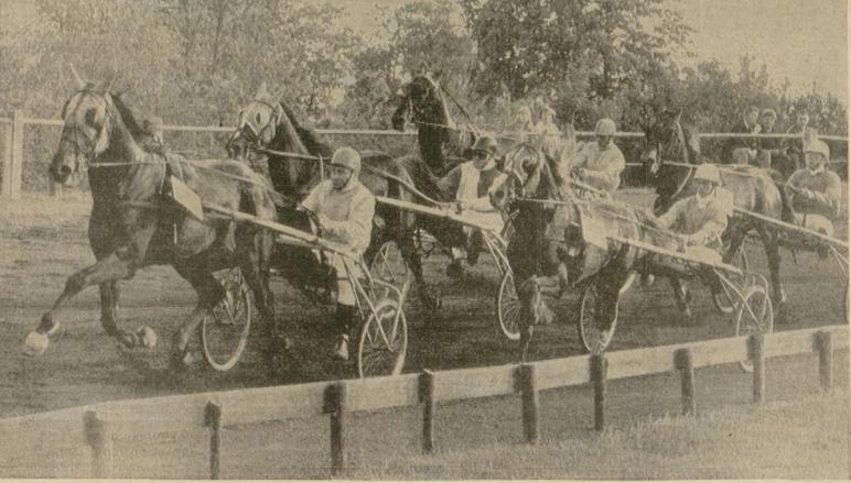 Aonne de Wrede op de drafbaan in Wolvega aan de reling met Heracles achter Ido Hanover met Bonne de Jong in 1970.